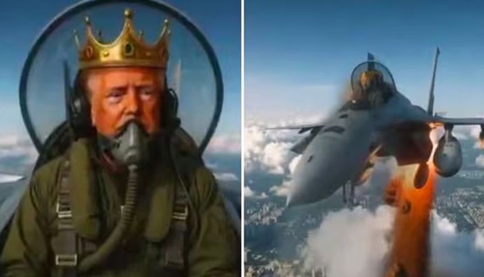 سوشل میڈیا پلیٹ فارم پر جاری کی گئی اے آئی ویڈیو میں ٹرمپ بادشاہ بنے تارج پہن کر جہاز کے کاک پٹ میں بیٹھے ہیں۔